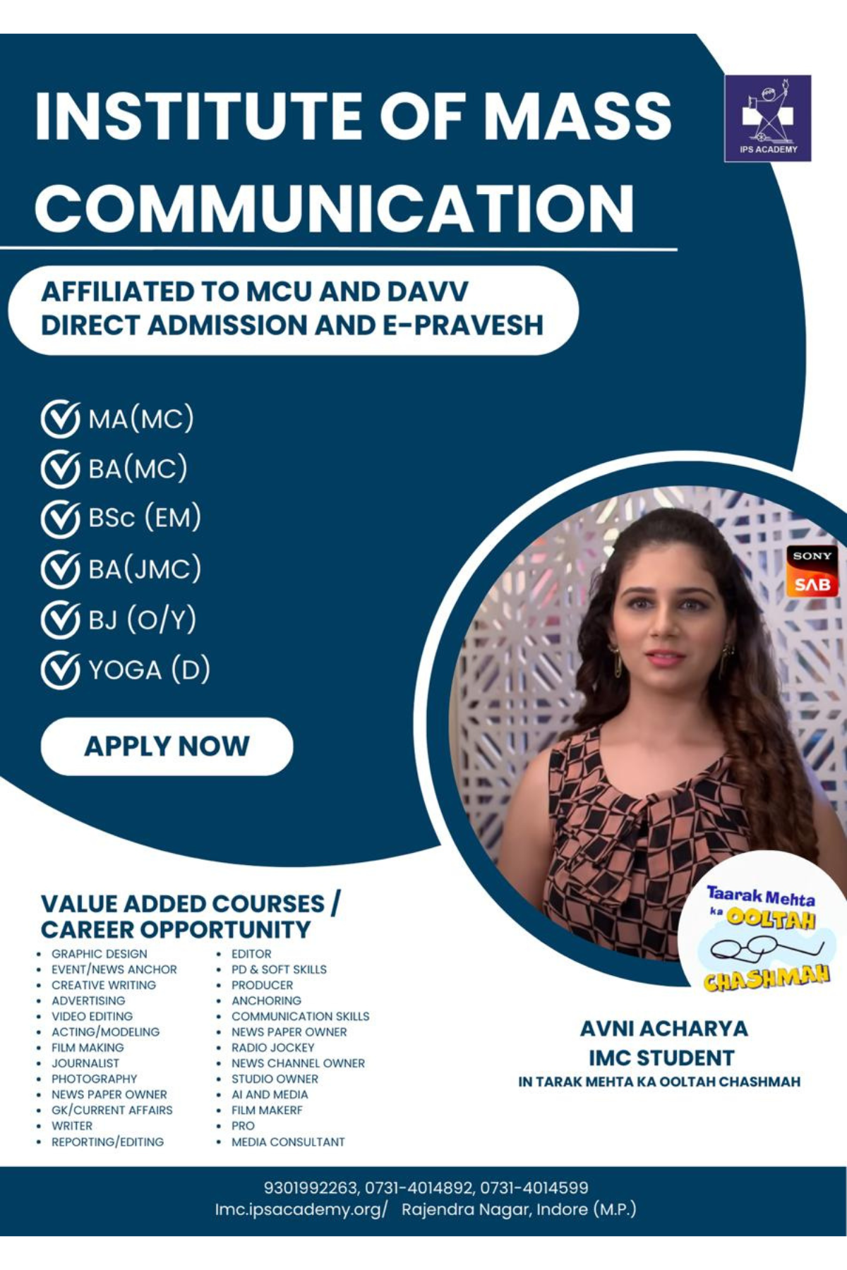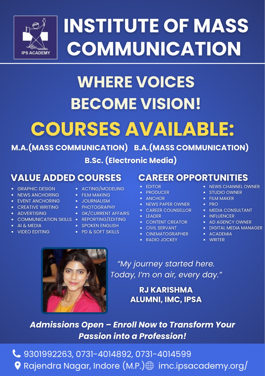 Mass Communication plays a vital role in shaping public perception and connecting people globally through various media platforms. It encompasses journalism, advertising, digital media, public relations, film making, modeling, acting, content creation, graphics, animation and more—making it one of the most dynamic and evolving fields.